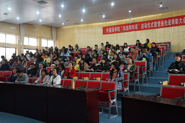 12月8日下午,外国语学院“与信仰对话”启动仪式暨党务先进表彰大会在庄为煊报告厅举行,外国语学院党委书记谢友福,院长黄小萍,党委副书记林庆祥,全体教工党员以及学生党员、入党积极分子参加了会议。