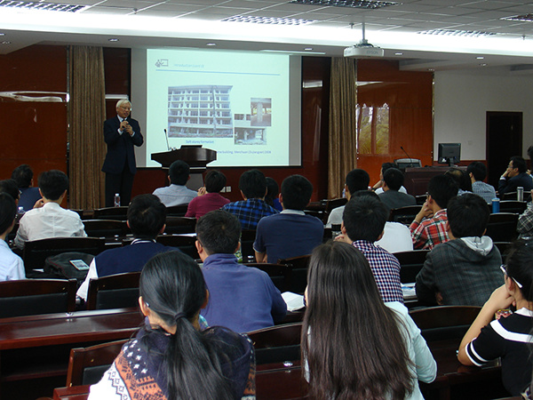 邝君尚以带填充墙对RC框架受力影响、精细化3D数值模型的建立、结构单元弹塑性动力时程分析、试验研究的相关进展及对设计的建议等为主题深入细致地介绍了他的研究进展和成果。报告会上,邝君尚还就试验研究的相关技术、填充墙材料模型的本构选择等问题与师生进行了交流探讨。