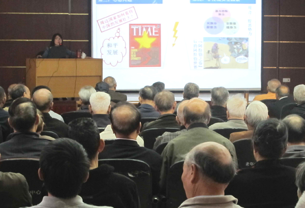 在报告会中,胡越云首先从静态、历史和现实三个不同的视觉角度全面介绍我国周边的国际环境,客观分析了我国当前周边安全形势,既面临难得的机遇同时面临严峻的挑战。她结合2013年在北京召开的“周边外交工作座谈会”精神,为离退休党员详细解读周边外交工作的指导思想及其对策。