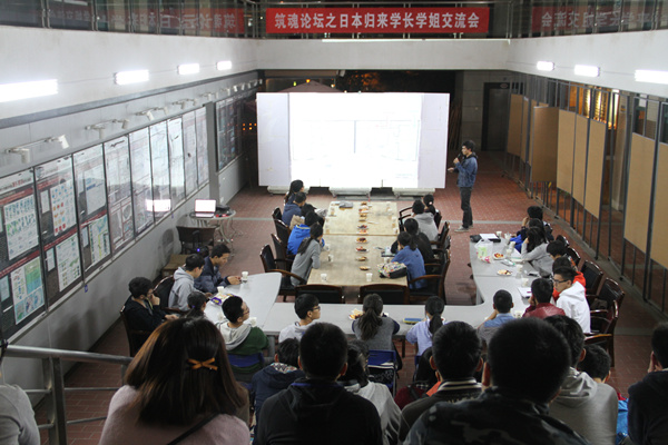 日前,由建筑学院学生会学习部主办的“筑魂论坛之台湾、日本归来学长学姐交流会”在建筑学院中庭举行。建筑学院建筑系主任吴少峰、台湾和日本归来学长学姐及2013、2014级同学参加交流会。