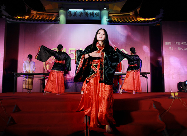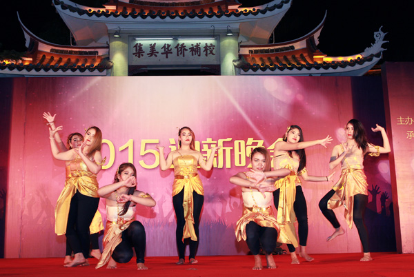 晚会节目异彩纷呈。舞蹈《神秘老挝》将观众们带入了老挝这个神秘国度,由菲律宾留学生带来的现代舞蹈《新时代》展现了菲律宾学生动感活泼的一面。来自学院主持人队的朗诵《岁月长流》情真意切,表达了他们对华文学院深深的爱意和无尽的祝福。安哥拉留学生的一曲《You are beautiful》深情款款,让观众们听得如痴如醉。泰国留学生的舞蹈《My ree》更是让大家感受到了浓浓的东南亚风情。紧接着院艺术团带来的综合节目《礼仪之邦》将传统歌舞、书画艺术结合,随歌而舞,伴乐而书,展现了浓郁的中国风。穿插在晚会中间的小游戏“爱的抱抱”使观众们可以上台互动,将晚会推向了高潮。院艺术团的歌曲串烧《曾经的你》《爱你在心口难开》别具一番风味。蒙古留学生带来的舞蹈《Mogolian mix》凭借其精彩的表演获得场内阵阵掌声。印尼留学生的《梭罗河》别具异国风情。最后由院啦啦队和预科部同学带来的街舞表演为此次晚会画上了圆满句号。