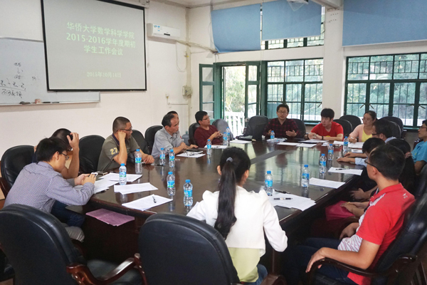 10月14日下午,数学学院2015-2016学年期初学生工作会议在数学学院306会议室召开。数学学院党委书记黄锦辉,副院长陈铭新、黄建新,团委书记黄永圳,以及学院各班级班主任参加会议。