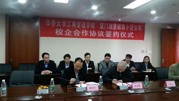 12月16日上午,工商管理学院与厦门湖里诚泰小额贷款股份有限公司校企合作协议签约仪式暨华侨大学工商管理学院创新创业实习基地揭牌仪式在诚泰公司举行。厦门湖里诚泰小额贷款股份有限公司董事长李云祥、常务副总经理黄剑辉、财务总监黄磐植,公司各部门负责人,部分员工代表,工商管理学院党委书记姚培生,团委书记文竞之,辅导员张钟元及学生代表出席仪式。