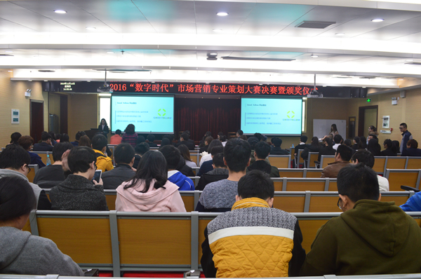 12月15日,2016年“数字时代”市场营销综合策划大赛决赛暨颁奖仪式在经管12楼举行。厦门苏菲玛索有限责任公司总裁杨之伟、副总裁黄俊帆,温思帝寝柜科技有限公司总经理张海洋,泉兴口腔医院代表陈天山、梁菊玲,工商管理学院院长孙锐,党委书记姚培生,市场营销系主任陈钦兰,市场营销系部分专业课教师出席比赛。