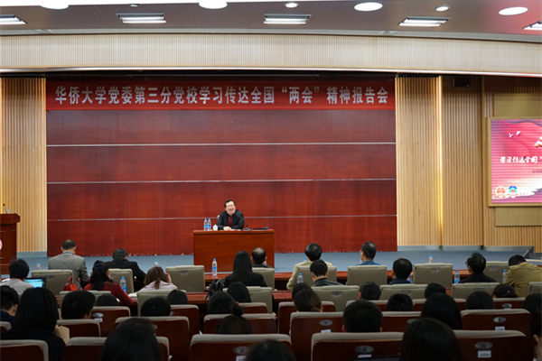 开班仪式后,第三分党校在陈嘉庚纪念堂科学报告厅举行了学习传达全国两会精神报告会。刚刚参加完第十二届全国人大第五次会议的全国人大代表、法学院副院长戴仲川教授担任主讲嘉宾,工学院、政治与公共管理学院、法学院、美术学院、外国语学院全体师生党员参加。