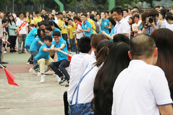 “一二!一二!……”激情振奋的助威声有节奏地响彻在华园,教师、职工、校友与同学们一起捋起袖子,憋足力气,参与到拔河比赛中。现场数百名同学手举楼栋牌号,挥舞彩旗与彩球,为比赛选手加油助威。