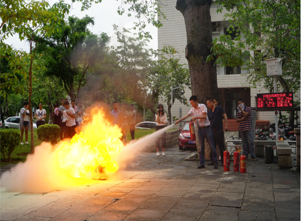 演练分为火灾逃生演练和油盆灭火训练,逃生演练要求一旦发现火情,火灾警报响起,在场人员要立即引导室内人员进行有序疏散,演练过程使用烟雾弹模拟了火情,增加了演练的真实性,整个过程紧张有序。随后还进行消防灭火演练,利用灭火器对油盆内的火焰进行灭火,教师及学生代表都进行了实际操作,保卫处人员指导灭火技巧,方便日后出现突发状况时可以沉着应对并利用室内的消防器材控制火情。演练结束后还组织老师及同学观看相关安全事故的展板,加强安全责任意识。