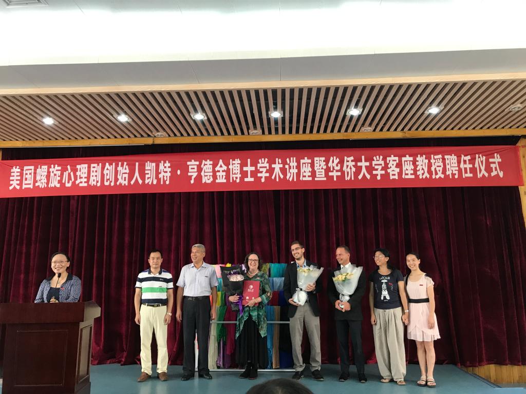 6月12日下午,副校长刘斌在庄为烜报告厅为美国螺旋心理剧创始人凯特·亨德金斯博士颁发临床心理学客座教授聘书。这也是凯特继2007年首次受聘后,再一次受聘并佩戴上华侨大学校徽。