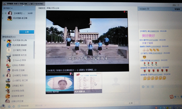 原来,群里正在通过视频直播“七月赞歌”机关教职工联欢晚会,庆祝建党96周年、建军90周年,表达对伟大祖国的美好祝福。这是机关党委、机关工会、机关团委共同举办的首场网络活动。