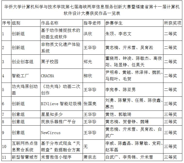 第七届海峡两岸信息服务创新大赛暨福建省第十一届计算机软件设计大赛决赛10月29日在福建师范大学举办,我校计算机科学与技术学院学子代表学校参赛,共获得二等奖5项、三等奖6项。
