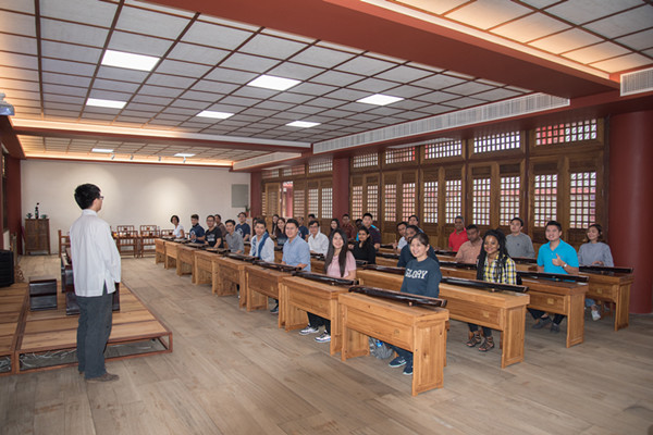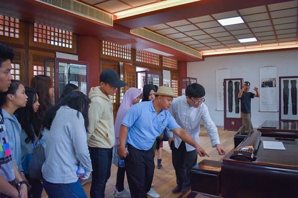 在有“古琴文化圣地,心灵休憩之所”之称的龙人书院里,龙人古琴的黄志禄、郑伊、王西倩等三位老师向留学生介绍古琴文化艺术,从孔子说起,介绍了古琴的历史、人物故事、古琴琴谱等,并演唱琴歌《鹿鸣》《送孟浩然之广陵》,古琴独奏《酒狂》《平沙落雁》等,展示古琴的音乐魅力。同学们都闭上双眼静静品味,老挝学生陈光辉说:“中国有着这样悠久的历史文化,并且能够将其很好的保存下来,今天我能够观赏和学习到感觉非常荣幸”。越南留学生阮氏清春说:“我们生活里有各种电子乐器,但是这样古朴的琴音让我都觉得非常平和安静,仿佛自己回到古代成为孔子的徒弟,感受着古老的中华文明。”