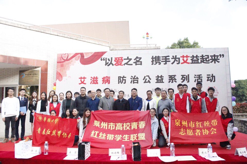 12月1日,为迎接第30个世界艾滋病日,更好地凝聚防艾志愿力量,并号召更多高校学生加入到艾滋病防治宣传队伍中,由华侨大学学生处、华侨大学团委、华侨大学红十字会、泉州市疾病预防控制中心、丰泽区疾病预防控制中心、华侨大学数学科学学院主办,华侨大学党委宣传部、华侨大学校医院、泉州市青春红丝带协会、泉州高校青春红丝带学生联盟、华侨大学青春红丝带协会协办,泉州微笑自行车公司特约赞助的“以爱之名,携手为艾益起来”艾滋病防治公益活动启动仪式暨颁奖典礼在华侨大学金川活动中心前召开。华侨大学数学科学学院党委书记林诗锋、华侨大学团委书记王坚、华侨大学学生处学生教育与发展中心郑志民、泉州市红丝带志愿者协会会长谢汉瑜 、华侨大学预防艾滋病健康教育工作领导小组办公室主任郭良,泉州市疾病预防控制中心黄亚兰,丰泽区疾病预防控制中心李金星、刘秋洁参加本次活动。