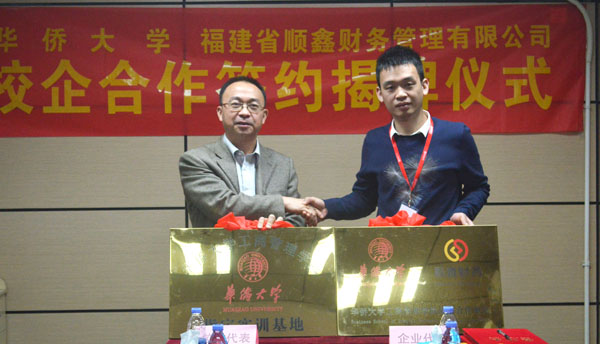 12月7日,工商管理学院与福建省顺鑫财务管理有限公司校企合作签约暨揭牌仪式在顺鑫公司财务会议室举行。工商管理学院党委书记姚培生、福建省顺鑫财务管理有限公司董事长吴声伟分别代表双方签约,顺鑫财务正式成为工商管理学院指定实训基地。