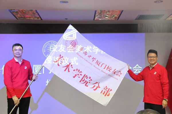 厦门校友会会长刘宜量(右)向美术学院分会首任会长胡永授旗
