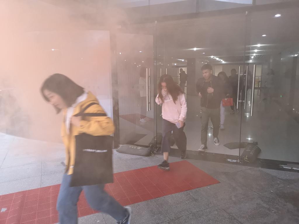 讲座后,作为本次安全教育活动的重要环节,音乐舞蹈学院全体2018级同学参与到应急疏散演练中去。17点整,随着警铃声的响起,红色浓烟升起,全体同学在学院辅导员的引导下,弯下腰,用手、袖子捂住口鼻,紧张有序地,从琴房、舞蹈房迅速撤离,按预定的疏散路线撤离到学院大楼外的空地。同时,学校保卫处安保人员迅速赶到现场,展开灭火营救措施。