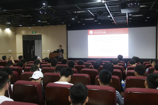 莫诒隆系统介绍了基于周期性超材料的工程结构基础隔震最新技术,分别介绍了一维至三维周期性超材料的提出及特点,基于周期性超材料的工程结构基础隔震的基本原理、理论验证、一维至三维隔震结构的数值模拟、结构模型野外试验与三维振动台验证,以及该技术在新一代模块核反应堆的隔震上的应用等最新的研究成果。其报告图文并茂、生动形象,深入阐述了概念新颖的基于周期性超材料的工程结构基础隔震基本原理,引起在场师生的广泛兴趣。报告结束后,多名教师和博士研究生与莫诒隆进行了深入而热烈的讨论与互动,学术气氛浓烈。莫诒隆还高度赞扬我校土木工程学院研究生的提问水平。