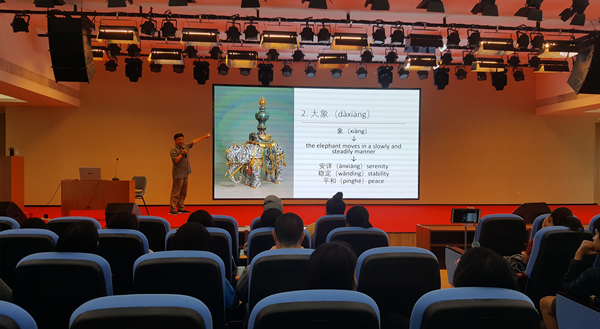 此次讲座为华文学院汉语言系“聆听中国——中华文化系列专题”第七讲。该院2018级“一带一路”沿线国家政府官员中文学习班、2019级皇太后大学中文交流班以及汉语言系、华文教育系部分留学生听取讲座。