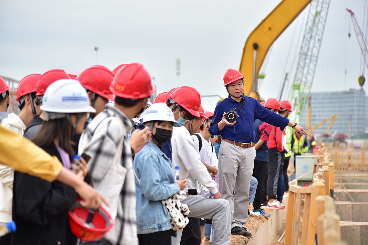 在施工现场,项目部总工张国文和马德川等,以及学院肖朝昀教授、苏世灼教授级高工、蔡奇鹏教授、陈星欣副教授等带领师生观摩,并为学生现场讲解。他们介绍了海沧海底隧道的工程概况,讲解了跨海域复杂地质条件、长距离下穿城市主干道、跨越临近重要地下结构等工程重难点问题及技术突破,并详细介绍了城市明挖暗埋隧道从基坑开挖到隧道主体结构施工再到地面线路恢复一系列施工工艺等。
