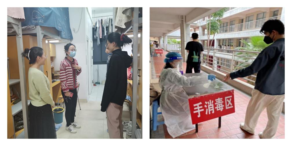 邹萍萍老师走访宿舍;王蔚芳老师为学生手部消毒