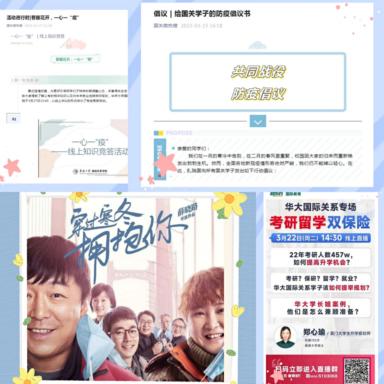 学院还举办一心一“疫”线上知识竞答活动,帮助同学们提前了解公考相关知识以及做好未来就业选择规划。开设国关专场讲座——《华大国际关系学子如何规划考研留学双保险》,邀请厦门大学生升学规划师郑心瑜老师讲解目前留学、考研大环境,指导同学们明晰在大学各个阶段需做好的各项准备。通过已经收获国内外名校录取的学长姐升学案例分享让国关学子们能够对未来升学路有一定的规划和思考。