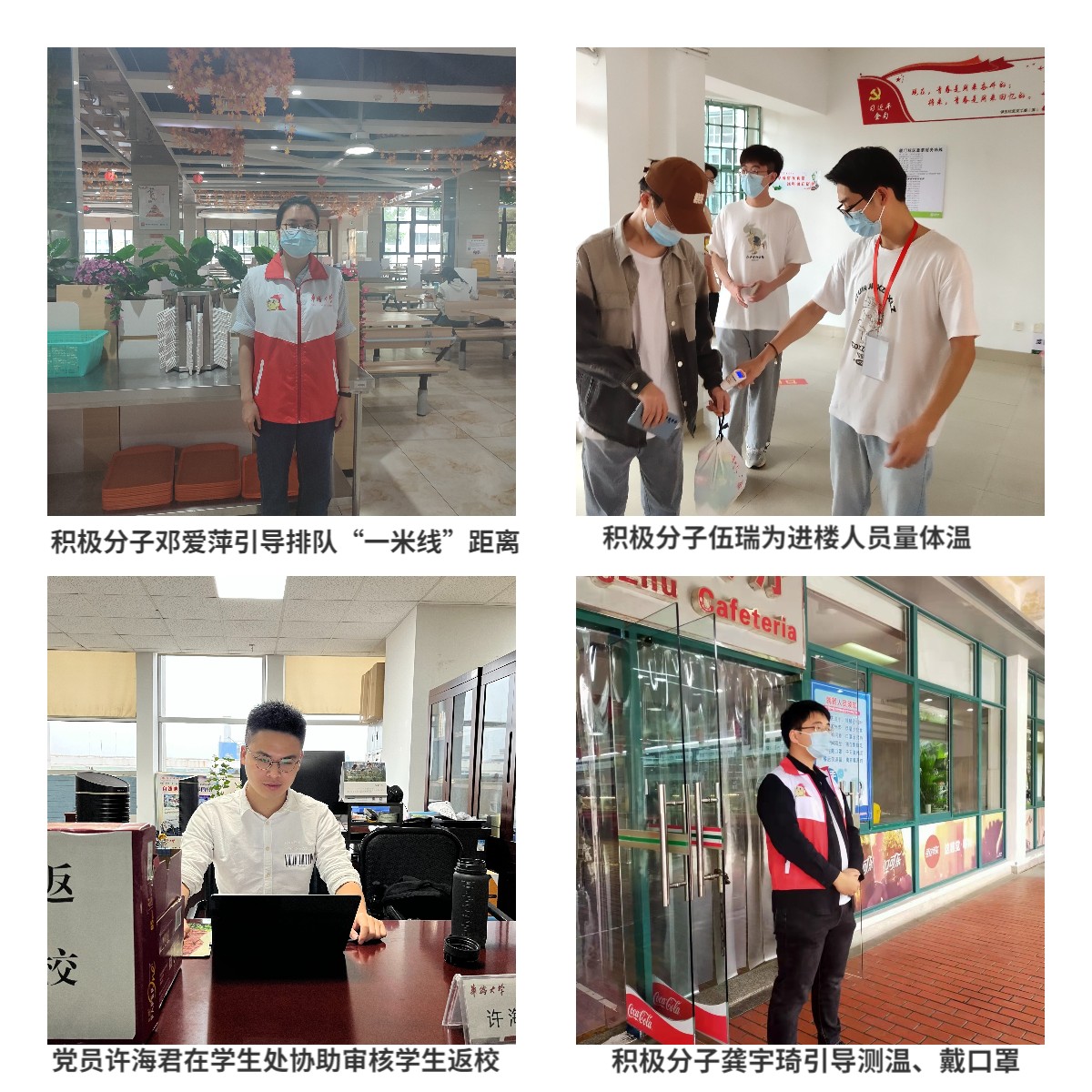 学生支部中诸多同学积极参与校园志愿服务,主动投身一线,彰显学生榜样力量。党员左慧杰、栾晴等同学主动报名协助校园核酸检测,维护检测秩序;积极分子伍瑞主动报名为楼栋进出人员测量体温,筑牢宿舍楼的“第一道防线”;预备党员艾兵、积极分子邓爱萍引导食堂用餐秩序,控制进出餐厅流量;积极分子赵朔为居家监测的同学代购餐食及生活用品;党员许海君担任兼职辅导员,疫情期间坚守岗位,积极协助学生处顺利完成各项工作任务。