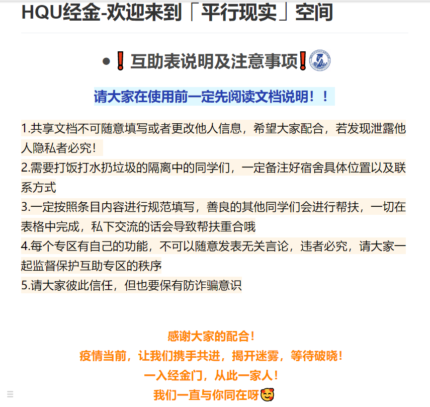 3月中旬,泉州突如其来的疫情打乱了很多同学的节奏,面对疫情防控政策,许多同学生活上面临不便。“很多上课用书放在图书馆和自修室,能不能拿回来?”“什么时候可以取快递?”“我微积分不好,有没有学长学姐有笔记可以借我参考……”为了更好地了解学生的疑问并解决学生的需求,经济与金融学院“平行现实空间”共享文档应需而生。