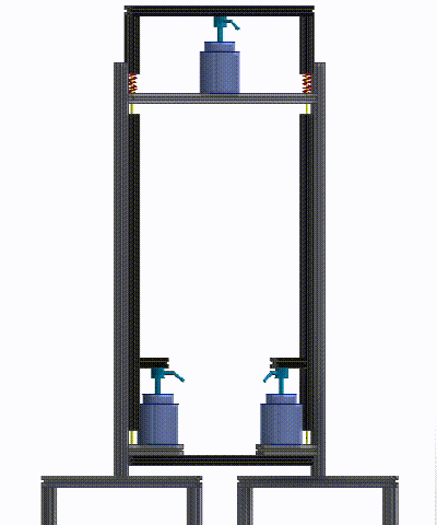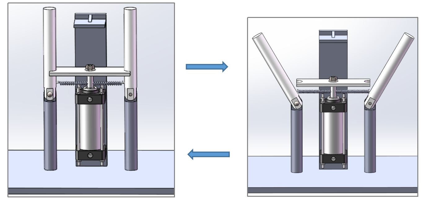 贺子健设计的装置由气缸、支柱、支撑杆、下挡板、上挡板和螺栓、螺钉、弹簧等组成。人们将废弃的口罩的两个“耳朵”套在两个支撑杆上,当堆积至一定厚度后就会将支撑杆打开,此时口罩被撑开,气缸会带动下挡板往上推,与上挡板配合,实现口罩的压紧。在废弃口罩被打包回收后,气缸和支撑杆也将复位。