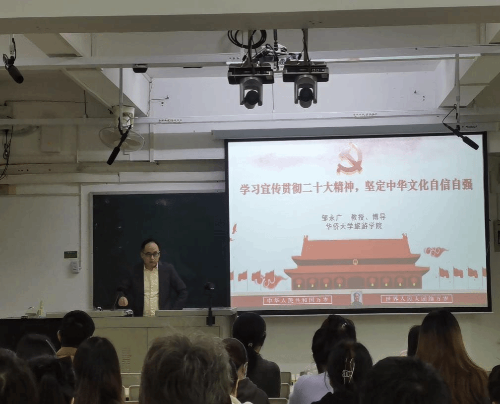 12月11日下午,由党委宣传部和旅游学院党委主办的学习宣传贯彻党的二十大精神系列讲座在经管楼3-3举办。华侨大学学习贯彻党的二十大精神专题宣讲团成员、旅游学院旅游管理系主任、泉州市第十三届“五四青年奖章”获得者博士生导师邹永广教授受邀宣讲。讲座以“学习宣传贯彻党的二十大精神,坚定中华文化自信——学习贯彻习近平总书记在党的二十大报告中关于文化和旅游的重要论述”为题展开,旅游学院全体学生党员参加。