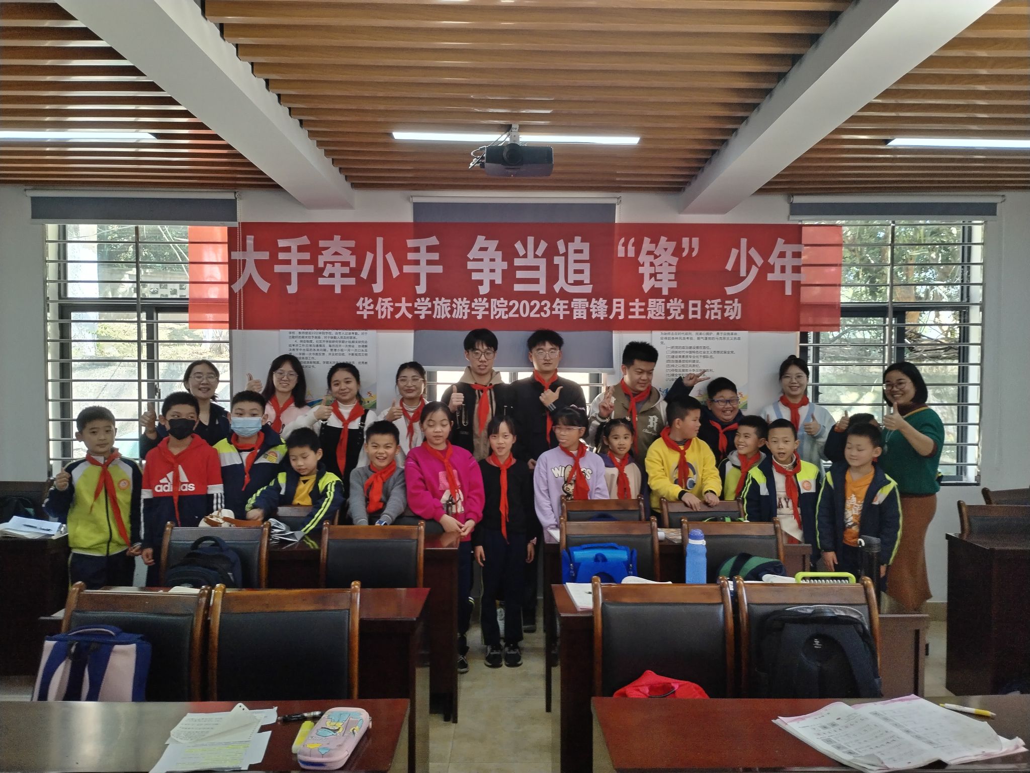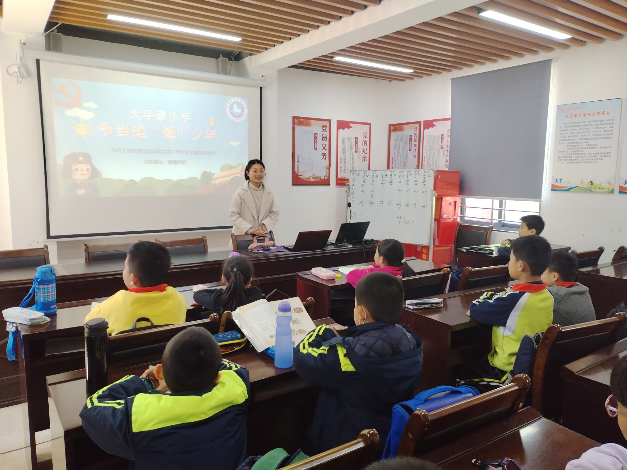3月6日中午,旅游学院本科生第三党支部学生党员来到华大社区,为社区小学生们开设了一堂专题微党课。2019级旅游管理专业本科生党员唐玉婷围绕“大手牵小手,争当追‘锋’少年”主题,向社区少年儿童现场授课。她用生动的语言、丰富的素材介绍了雷锋生平,讲解了雷锋故事,阐释了雷锋精神,并结合身边的学雷锋行为与社区少年儿童积极互动,号召大家共同传承雷锋精神,争做追“锋”少年。微党课在齐唱《学习雷锋好榜样》的歌声中圆满结束。