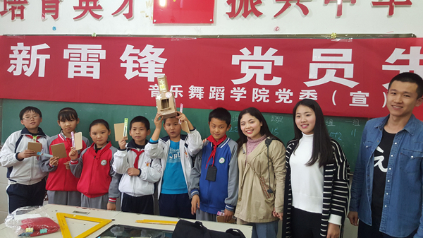 活动现场,学生党员讲解了手工乐器的制作技巧,鼓励小朋友们在制作过程相互帮助,传递助人为乐、团结互助的社会正能量。随后,在学生党员的带领下,各小组各尽其能、发挥所长,用易拉罐做出沙锤、吸管做出排箫、纸盒与橡皮筋做出漂亮的五弦琴等,而最有创意的是第六小组学生在党员赵岱斌的指导下,用简单的快递盒子和橡皮筋做出的“快递吉他”,并用手工制作“快递吉他”弹唱小星星,将现场的气氛推向高潮,并获得了“创新小雷锋”的称号。