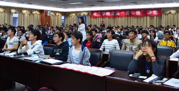 11月28日下午,化工学院团委主办的首届化工学院“青年说”讲堂——我要说给世界听,在郑年锦图书馆二楼报告厅举行。学院2014级的九个团支部选取不同的主题开讲,来自学院各年级共200多位学生代表参加本次活动。化工学院、学生处、校团委及其它学院共八位青年老师担任本次活动的评委及点评嘉宾。