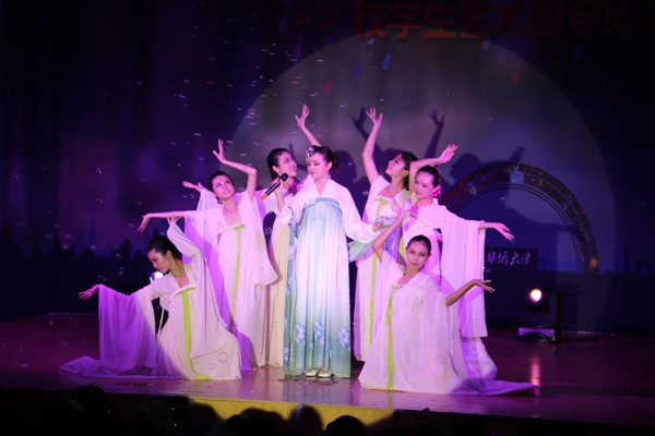 “渡山水几程,也曾望断秋水对月念君归。凭栏徘徊终未闻,今宵不怅平生如一梦。”婉转流淌出的古典音符,轻着罗衫的表演者婀娜多姿的舞蹈动作,瞬间将观众带入了那段已被时光掩埋的风酥雨忆。器乐队民乐与西洋乐混搭而成富有节奏感的《金蛇狂舞》让人为之震撼,悠扬乐声与朗诵者浑厚嗓音完美结合的《会唱歌的鸢尾花》感人泪下,传统特色鲜明的舞蹈《东城决》让人眼前一亮,“穿越而来”的上海滩舞女带来的《十字街头》特色舞蹈等都精彩万分,赢得了现场的热烈掌声。