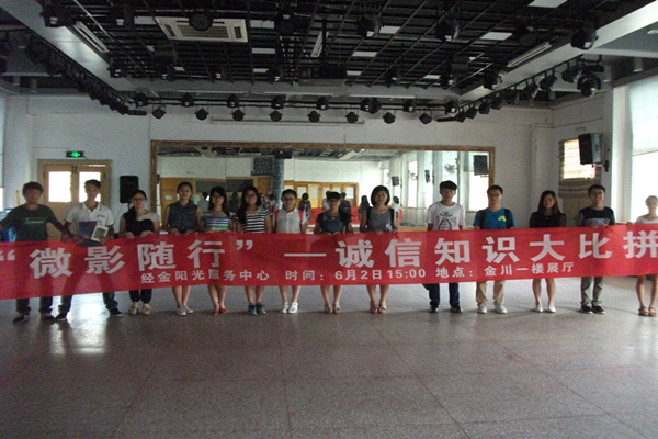 6月2日下午,由经济与金融学院阳光服务中心举办的“微影随行”诚信知识大比拼在金川活动中心一楼大展厅如期举行,院学生团委副书记何佳琦、阳光服务中心学生干部、各班阳光成长计划成员参加。