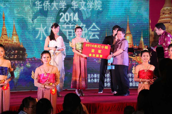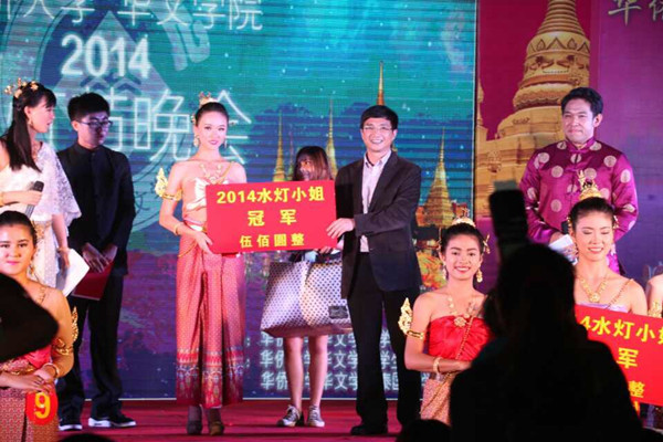 来自菲律宾、缅甸、印尼、中国和中国香港等国家和地区的的15位佳丽进入此次水灯小姐大赛决赛,选手分别来自华文学院、音舞学院、建筑学院、厦航学院、材料学院、土木学院等。在才艺展示环节,缅甸民族舞蹈《雪山上的一朵花》、印尼舞蹈《BANDA URANG》、维吾尔族舞蹈《西域风情》、傣族舞《雨竹林》,各具特色的民族舞蹈彰显了不同民族风情,赢得评委观众的阵阵掌声。古筝弹奏《枫桥夜泊》、二胡表演《烽火操》、琵琶独奏《送我一朵玫瑰花》,优美婉转的旋律,让整个现场笼罩在一片古色古香的氛围之中。伴随着动感的节奏,台下观众争相上台,为自己喜爱的选手献上花环以示支持。最终,5号选手纪媛获得本次大赛的冠军,8号选手何月仙、3号选手陈诗诗分获亚军与季军,3号选手郭迪拉获得最受欢迎奖。