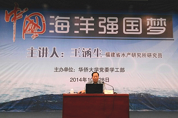 10月28日下午,福建省水产研究所研究员王涵生应邀做客华大,在陈嘉庚纪念堂科学厅畅谈“中国海洋强国梦”。讲座由党委学工部主办,学生处副处长黄建烽主持。