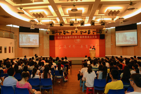 10月21日下午,经济与金融学院第十届团委、学生会成立大会在洪祖杭四楼明德堂召开,经济与金融学院团委书记郑志民,学工办副主任孙君芳,辅导员魏利斌、严雪、李雅婷,第九届团委、学生会负责人,第十届团委、学生会全体成员出席成立大会。
