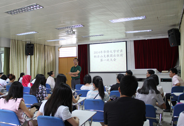 7月11日上午,华侨大学积石山支教团出征前第一次全体成员大会在泉州校区金川活动中心二楼会议厅召开。校团委书记李庭志,校团委秘书杨钟祥,2013年积石山支教团带队老师董艺乐,2014年带队老师余宗钟以及2014年华侨大学积石山支教团的全体成员参加会议。