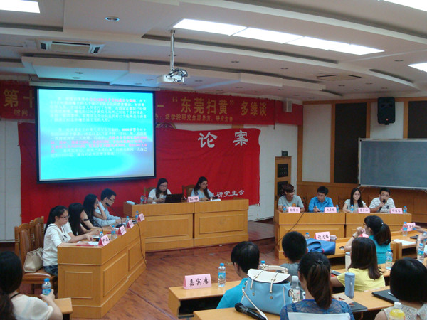 6月17日,法学院第十一期“纵横论案”在祖杭楼2-7教室举行,本期主题为“‘东莞起风,花落多少’——东莞扫黄多维谈”,邀请到法学院吴情树副教授、陈斯彬副教授以及谢达梅博士做点评嘉宾,校研会前主席蔡迪、法学院研会前主席周伟、法学院学生会主席练逸潇及各学院研会主席出席。法学院尹娟、庄莉莉、苏雪冰、杨佳容,经济与金融学院马宇博、外国语学院阳莉、公共管理学院张维伦等八位学生嘉宾受邀出席。本期论案由法学院研会主席孙帅主持。