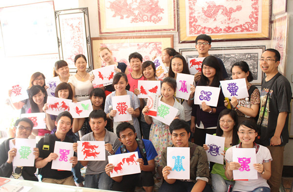 留学生展示剪纸作品