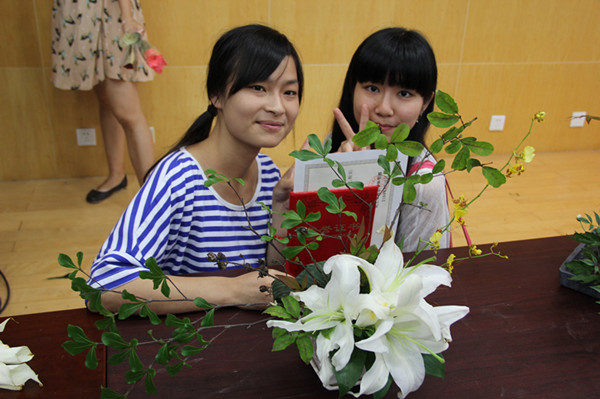 在由华侨大学花艺协会承办插花比赛中,来自华侨大学、集美大学、厦门工学院三所院校的20支队伍报名参赛,经过初赛选拔,有6支队伍进入当天的决赛。最终,来自2011级园艺专业的刘沁楚、罗倩羽凭借作品《素心》夺魁。