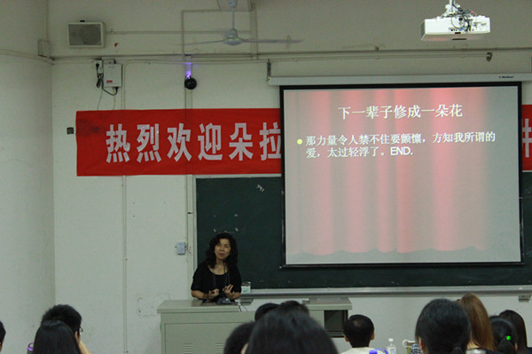 朵拉以幽默的语言向同学们介绍了海外华文文学的两种形态,并重点讲述了马华文学的成长历程。针对政府冷落华文教育的现状,她解释说,更多的华文教育者正不遗余力地为传播华文做出自己的贡献。她最后用自己的短篇散文《一朵花的修行》真实地表达了自己与华文与祖国的深厚因缘,赢得在场同学热烈掌声。