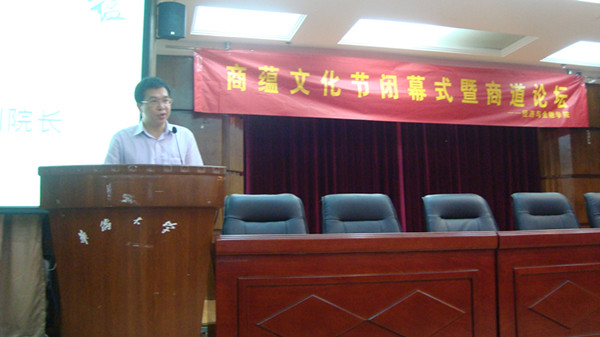 陈志森作为企业代表致辞,商蕴文化节通过邀请知名企业家、学者开设讲座,为学校与社会连接搭建了一个平台,互联网金融是科学技术发展的必然趋势,机遇与挑战并存,希望通过商蕴文化节的开展,为国有银行转型与发展提供契机。