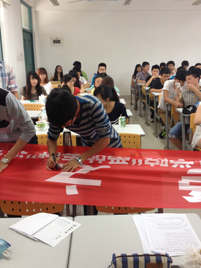 全体同学在横幅上签名并承诺:积极参与各项志愿服务活动,伸出双手,奉献爱、传递爱,用爱融化冷漠,让爱溢满人间。