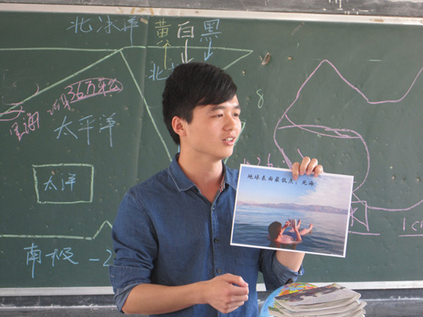 支教成员们通过教授学生读图、识图、画图的综合式教学方法来启蒙学生。志愿者借助手绘地图、地球仪、学习卡片等教学用具进行讲解,让同学们对世界“七大洲四大洋”地理分布及世界自然景观有个直观的印象。
