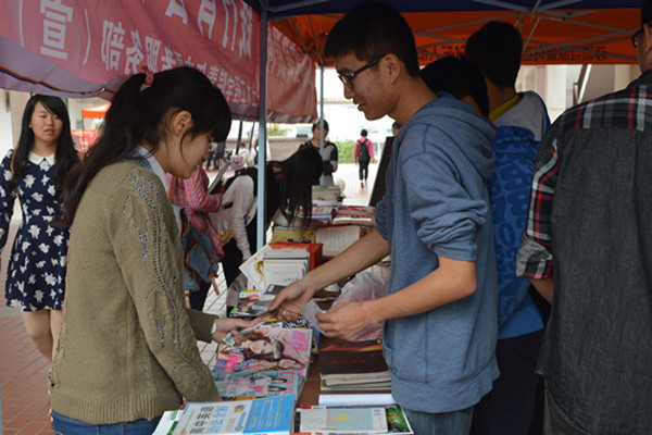 土木工程学院的青协干事在全校开展图书募捐,并于20日将募捐的图书进行义卖。路过的同学们纷纷驻足,聚集在义卖帐篷下挑选自己喜欢的图书。