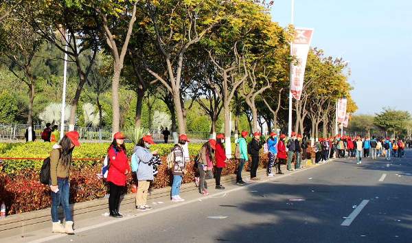 根据学院志愿者部的统筹安排,志愿者们分别乘坐40余辆大巴前往五缘大桥,而后步行进入各志愿服务地点。从马拉松起点五通灯塔公园起,志愿者以2米的间隔分散在5公里的路上。比赛开始前为参赛选手都指引路线,提供服务;鸣枪起跑时,志愿者为运动员呐喊助威;运动员归来时,志愿者们为他们喝彩。