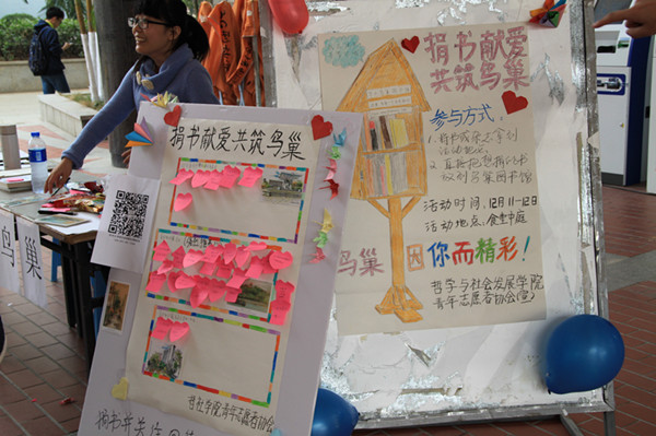 12月11日日12日,哲社学院青年志愿者协会组织的“捐书献爱,共筑鸟巢”活动在食堂中庭开展。