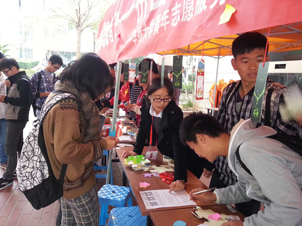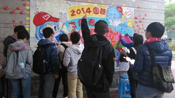以“拼出志愿者的精彩”为主题的拼图活动在食堂中庭进行。中庭墙上一块高两米,宽三米的灯布在12月3日挂起,上面绘制了拼图的模糊图案。拼图活动中共有四个小任务,同学们抽签完成。在拼图值班现场,志愿者们引导同学们到拼图前完成任务。参与活动的不仅有我校大学生,也有不少小学生来参与。