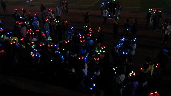 12月6日晚上,校青协和驴友协会联合举办的“Lighten my way”——荧光跑活动举行。参与者们集结到了操场上领取荧光物资,并在写有“无志愿不青春”的横幅上签下自己的名字和祝福。随后,同学们从操场上出发,途径泛华楼、沿湖大道、学校南门、LED屏最后回到操场。