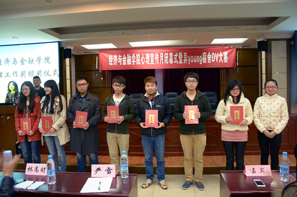12月5日晚,由经济与金融学院主办的心理健康月闭幕式暨“异young”宿舍DV大赛在经管12楼多功能厅举行。学院辅导员严雪、林高财,校心理服务中心副主任郑洁仪,院第九届心理服务中心主任许永业担任评委。院学生团委副书记、心理服务中心负责人、各班级心理保健员、参赛宿舍代表等参加了本次活动。